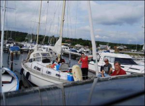 Uebernahme der Charteryacht. Nach einer langen Anfahrt am Sonntag nach Frederikshaven im noerdlichen Daenemark, nahmen wir die resrevierte Faehre von Stena Line nach Goeteborg. Die Anfahrt zum Ausgangshafen unserer Najad 34 war sehr schwer zu finden, darum kontaktierten wir unseren Vercharterer, der sich sofort bereit erklaerte uns abzuholen. Es ist wirklich eine sehr schöne etwas aeltere Yacht, Ketschgetackelt mit Langkiel. Das Gepaeck und die Lebensmittel wurden verladen und los ging es zur naechsten Ankerbucht.